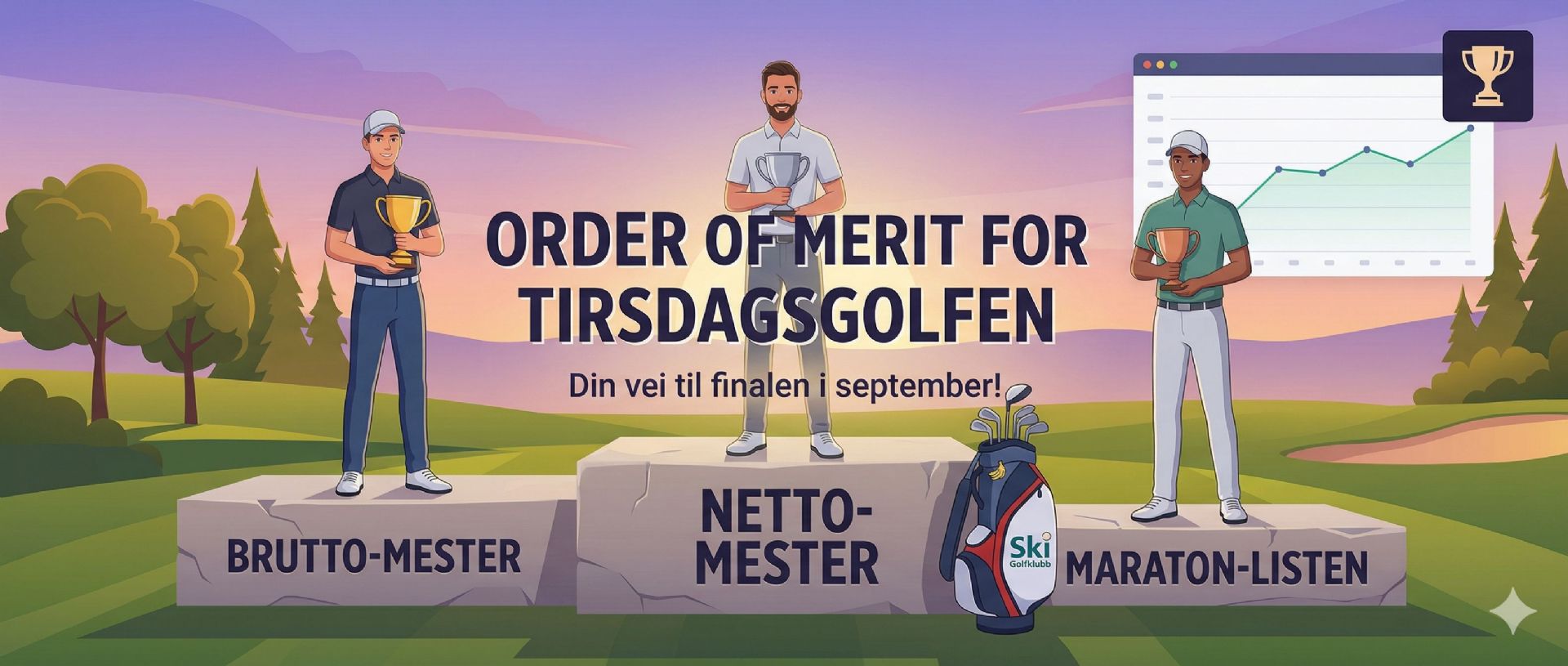 Tirsdagsgolfen går gjennom hele sesongen og består av tre forskjellige Order of Merit-lister. Dette sikrer at vi kårer vinnere basert på både råstyrke, handicap-prestasjon og trofast deltakelse.